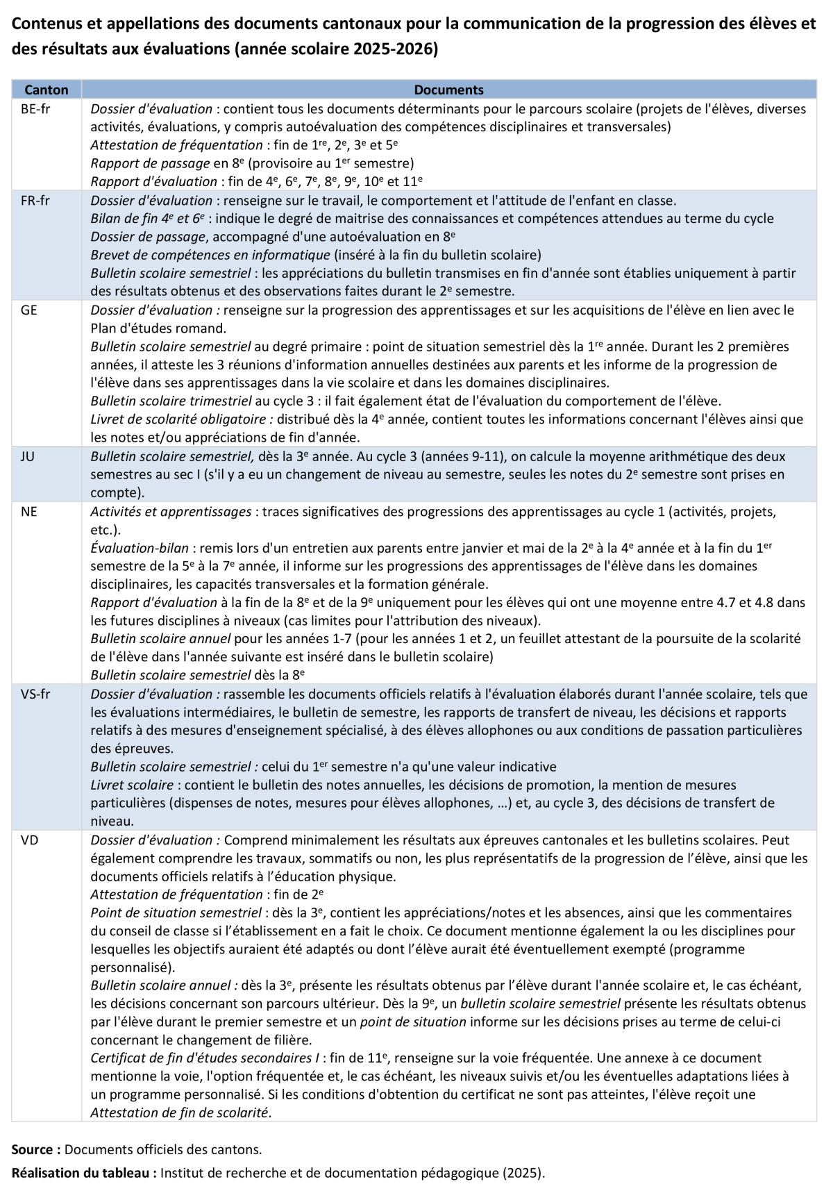 Les bulletins scolaires désignent des documents officiels qui sont renseignés par les enseignants et enseignantes et destinés aux élèves et à leurs représentantes et représentants légaux (RL ci-après). Ils sont utilisés pour rendre compte globalement des résultats des évaluations par semestre et année, et constituent un moyen pour attester des progressions d'apprentissage des élèves (appréciations non chiffrées et/ou notes). Ce sont les cantons qui fixent la forme, le contenu et la fréquence de transmission de ces documents.