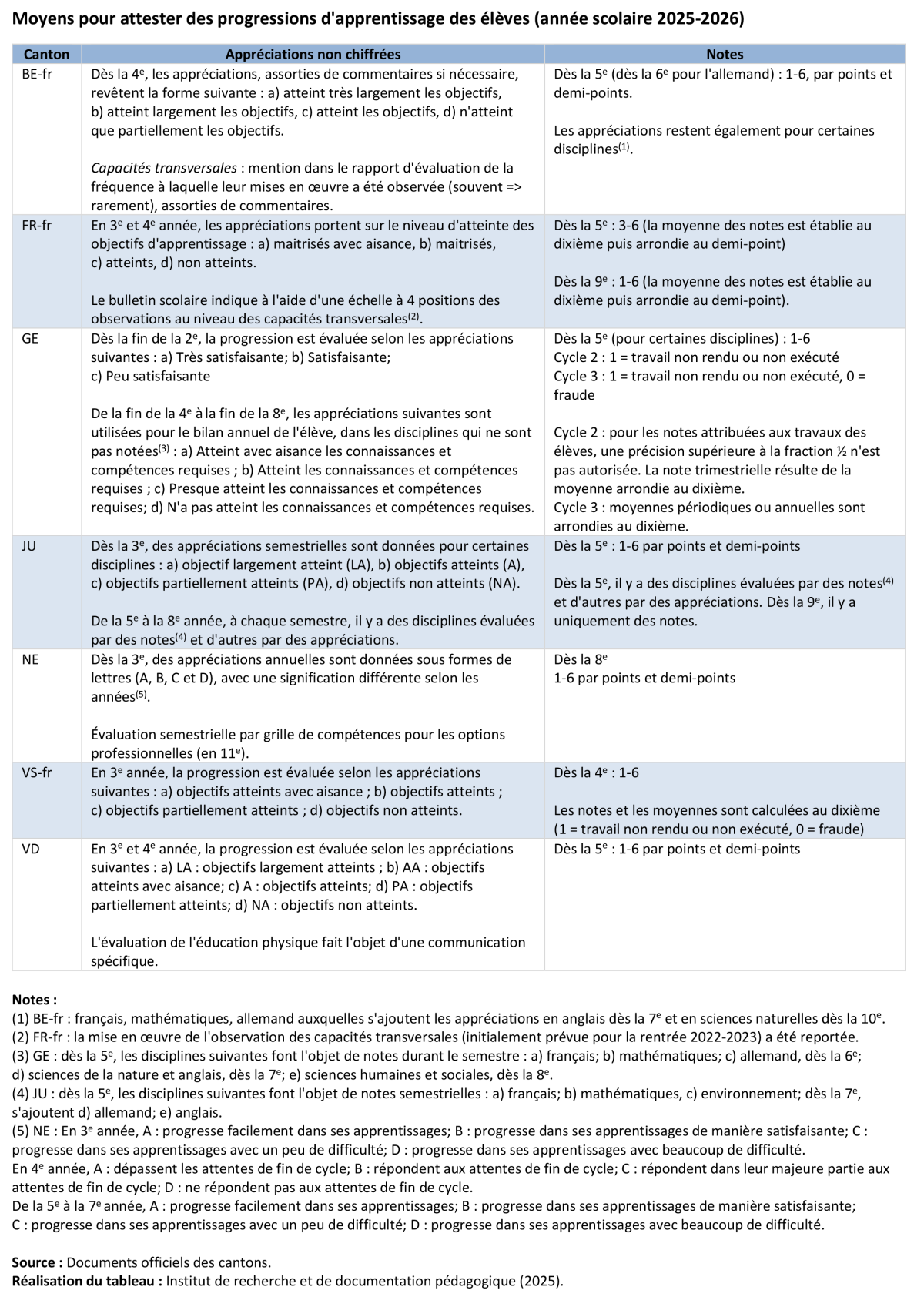 Dans l'Espace romand de la formation, les appréciations non chiffrées (différentes selon les cantons et les années) font leur apparition dès la 3e ou 4e année. Les notes, quant à elles, apparaissent en 4e année dans le canton du Valais, en 5e dans les cantons de Fribourg, de Genève, du Jura et de Vaud, en 6e dans le canton de Berne et en 7e dans le canton de Neuchâtel.
