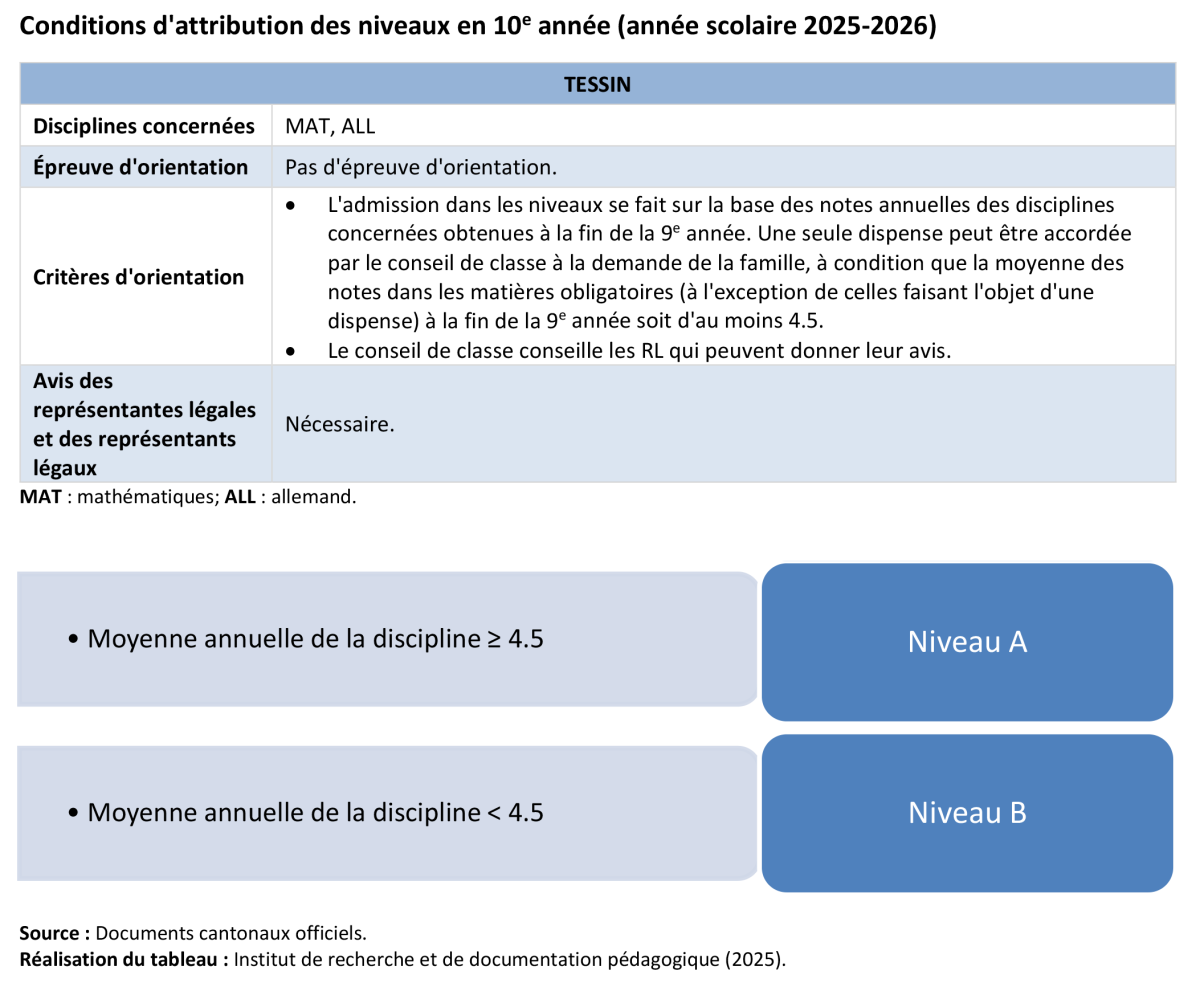 Le canton du Tessin prend en compte les résultats des élèves en mathématiques et en allemand, ainsi que l'avis des RL. Pour rappel, le concordat HarmoS prévoit une disposition autorisant le canton du Tessin à déroger à la prescription relative à l'aménagement des structures scolaires, et le degré secondaire I commence déjà en 8e année. La sélection des élèves s'effectue uniquement en 10e année.