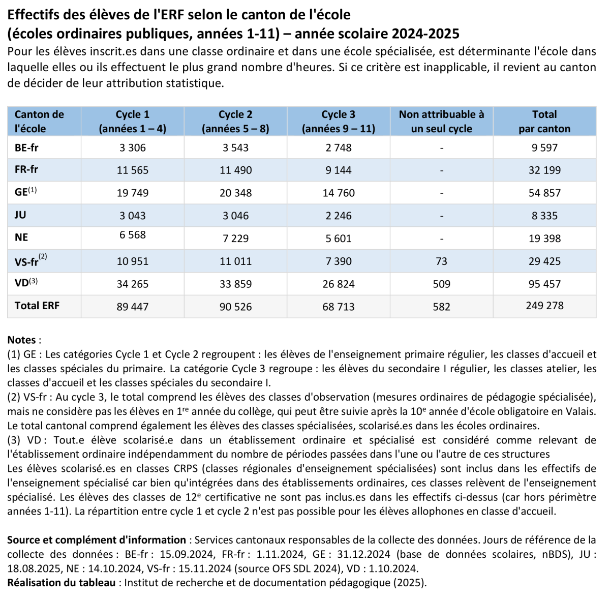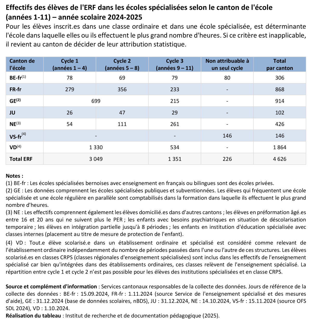 Les effectifs des élèves des écoles spécialisées sont en constante variation due à la politique de l'école inclusive propre à chaque canton. De ce fait, on compte moins d'élèves dans les écoles spécialisées de l'ERF en 2024-2025 (4'320) par rapport à 2023-2024 (4'554).Évolution des effectifs des élèves fréquentant une école publique ordinaire (selon le canton de l'école)