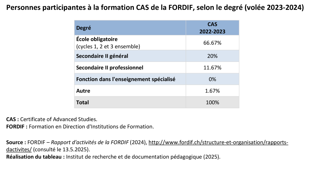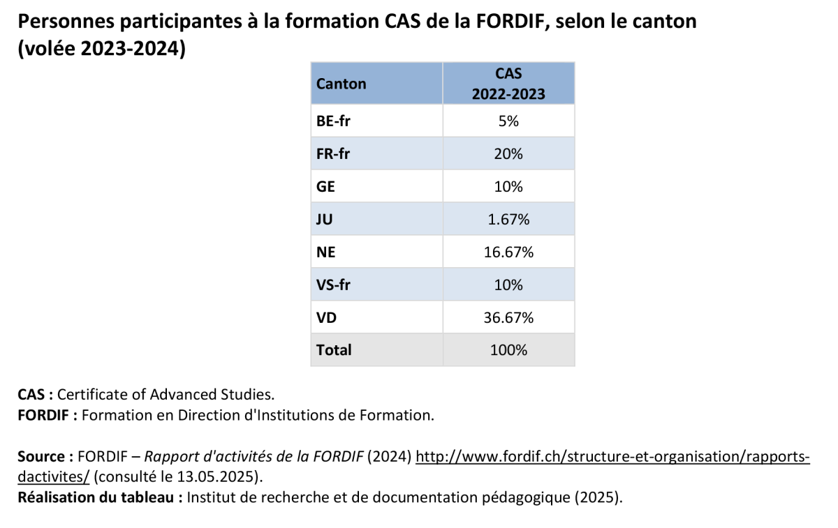 Pour consulter les informations complémentaires sur la collecte des données telles que les objectifs, le niveau d'enseignement visé, les cantons concernés et la période des mises à jour des données, cliquez ici.La Formation en Direction d'Institutions de Formation a été mise en place en 2008 sur mandat de la Conférence intercantonale de l'instruction publique de Suisse romande et du Tessin (CIIP) par un consortium réunissant quatre Hautes Écoles : la Haute École pédagogique du canton de Vaud (HEP Vaud), l'Institut de Hautes Études en administration publique de l'Université de Lausanne (IDHEAP), la Haute École fédérale en formation professionnelle (HEFP) et l'Institut universitaire de formation des enseignants de l'Université de Genève (IUFE).
