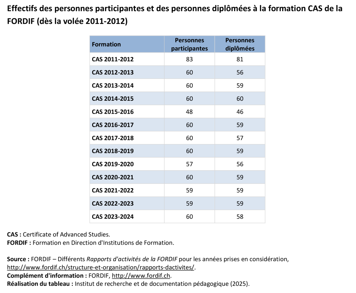 Effectifs des participantes et participants et des personnes diplômées de la Formation en Direction d'Institutions de Formation (FORDIF) qui offre une filière tertiaire de formation certifiante des cadres scolaires.