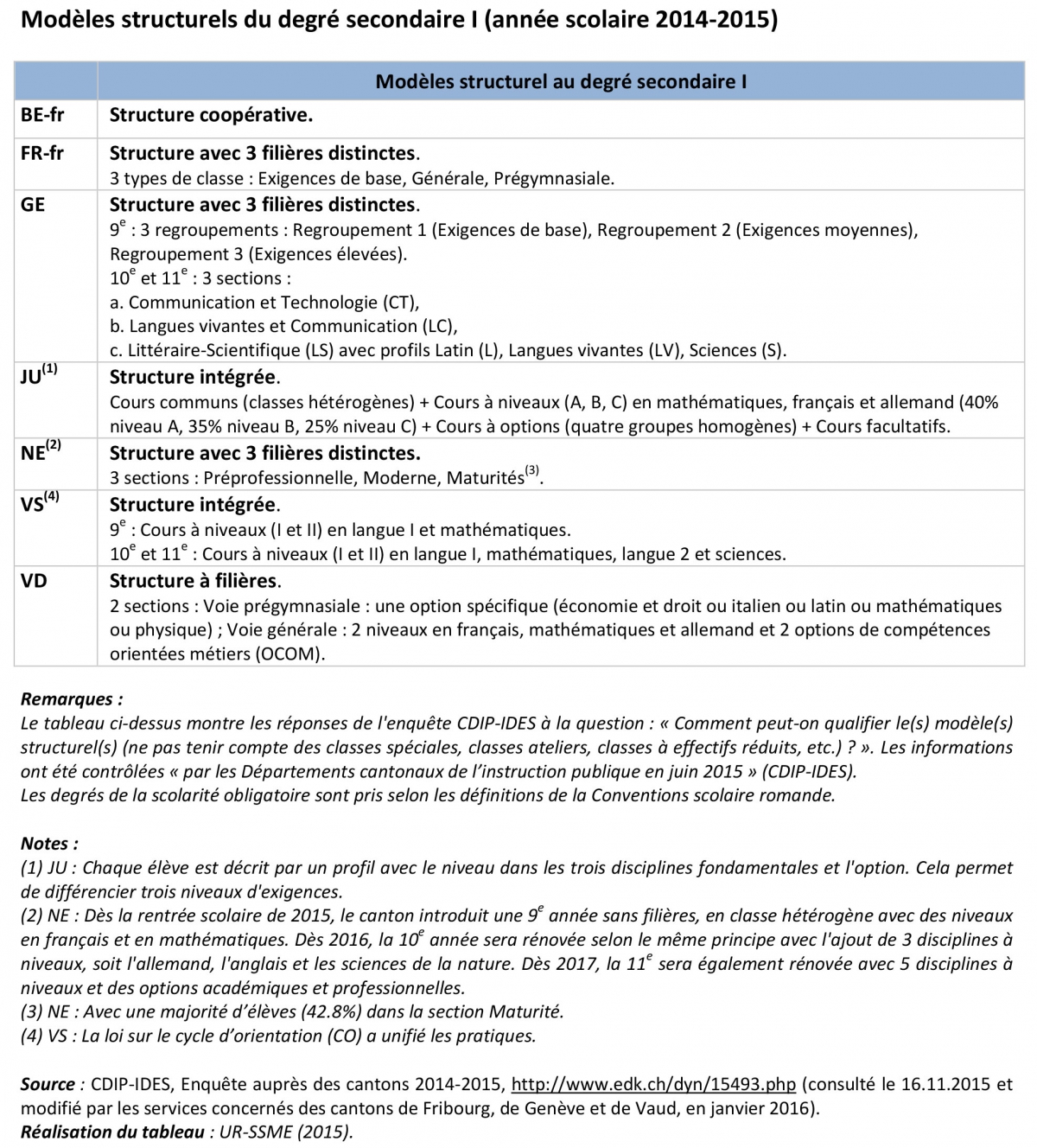 En Suisse, « le degré secondaire I est bâti sur différents modèles. Soit le canton applique partout l'un des modèles ci-dessous, soit il laisse à ses communes le choix entre plusieurs modèles :