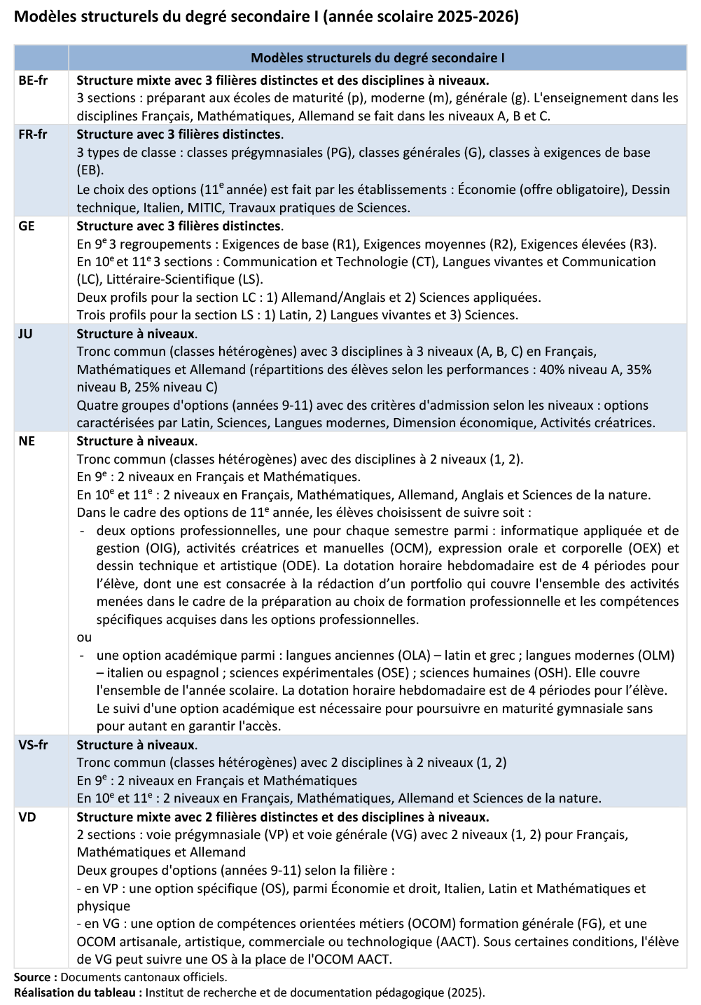 - Les cantons de Berne et de Vaud ont une structure mixte avec des disciplines à niveaux à l'intérieur de filières distinctes.