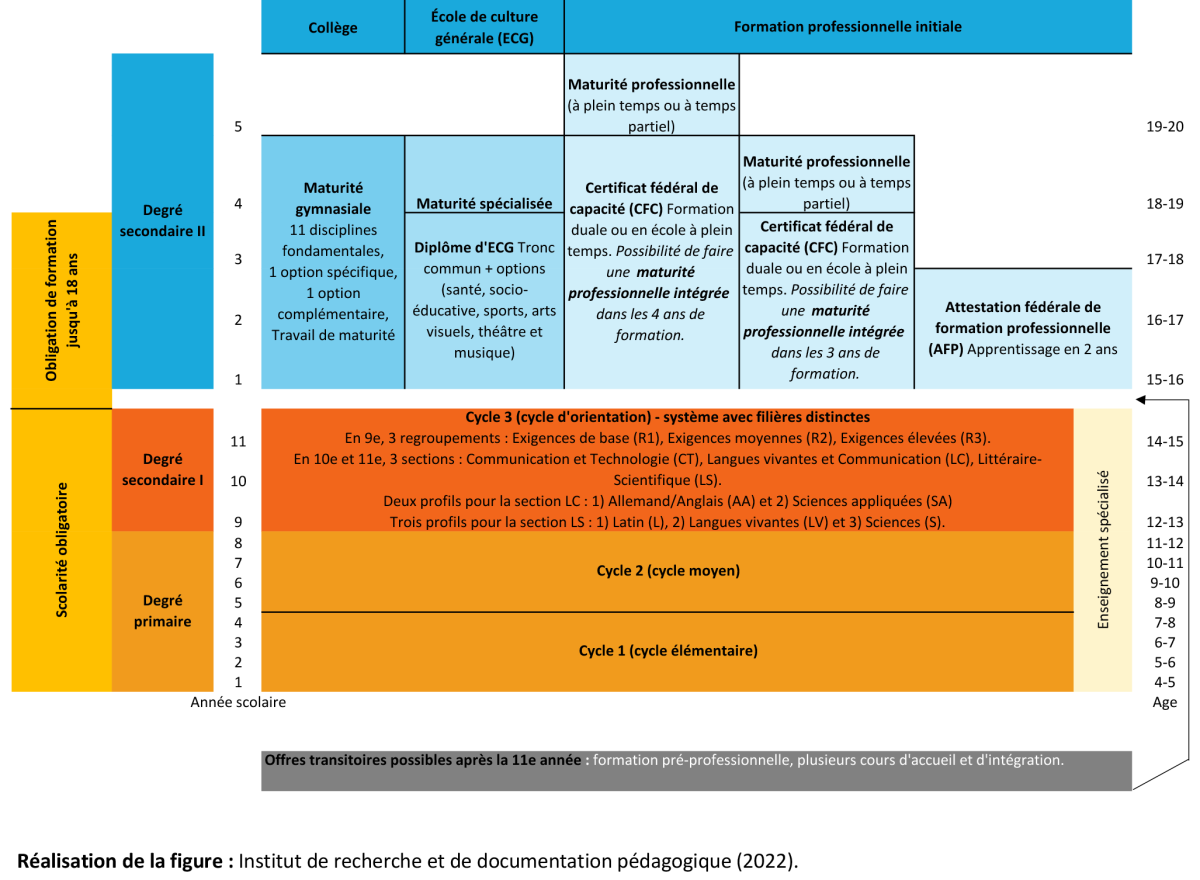Concernant le degré secondaire II, des dénominations différentes se rencontrent uniquement pour les écoles préparant à la maturité gymnasiale : Collège pour les cantons de Genève et du Valais, Gymnase pour les cantons de Berne, de Fribourg et de Vaud, Lycée pour les cantons du Jura, de Neuchâtel et du Tessin. Les informations contenues dans ces schémas sont une compilation d'informations disponibles sur les sites des différents cantons ainsi que dans la page Structures scolaires sur le site de la CDIP. ConstatsMise à part des dénominations cantonales différentes, les cantons peuvent également choisir des modèles d'organisation différents pour la scolarité obligatoire.
