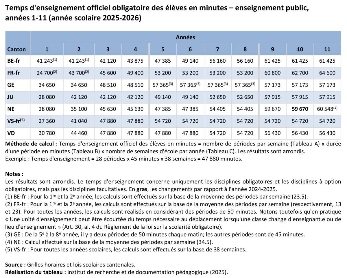 Le temps d'enseignement officiel obligatoire (années 1-11) est le temps passé en classe (ordinaire ou particulière, par exemple en salle de sport ou dans la nature pour une leçon de géographie) par les élèves (sans pauses, appuis, temps d’accueil, etc.), calculé selon des informations contenues dans des documents cantonaux officiels.