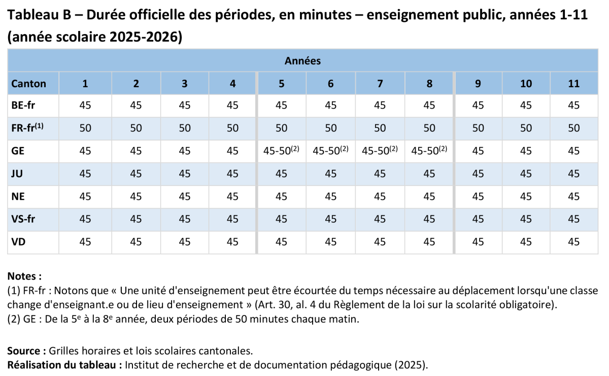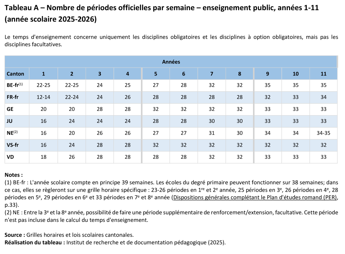 ConstatsPar rapport à l'année scolaire 2024-2025, en 2025-2026, uniquement le canton de Neuchâtel signale un changement du nombre de périodes : avec l'introduction d'une période en 10e année de Médias, science informatique et usages dans le domaine de l'éducation numérique, la dotation horaire hebdomadaire passe de 33 à 34 périodes.