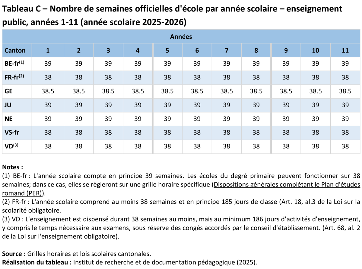 Le temps d'enseignement officiel obligatoire des élèves est spécifique à chaque canton. Il est calculé selon des informations données par des documents officiels cantonaux. Notons qu'il s'agit du temps d'enseignement officiel obligatoire et non pas du temps d'enseignement réel dont les élèves bénéficient. Le temps réel est très difficile à calculer, car il peut être spécifique même à chaque classe. Notons également que le nombre de semaines d'école est déclaré par chaque canton et ne comporte pas une définition unique (par exemple, semaines avec jours fériés comptées ou non).